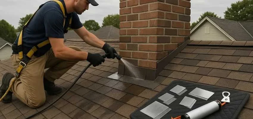 We examine crown slope, cap fit, mortar joints, brick or stone surfaces, and flashing transitions at the roofline. In Esquesing, Milton this area is often the origin of leaks.